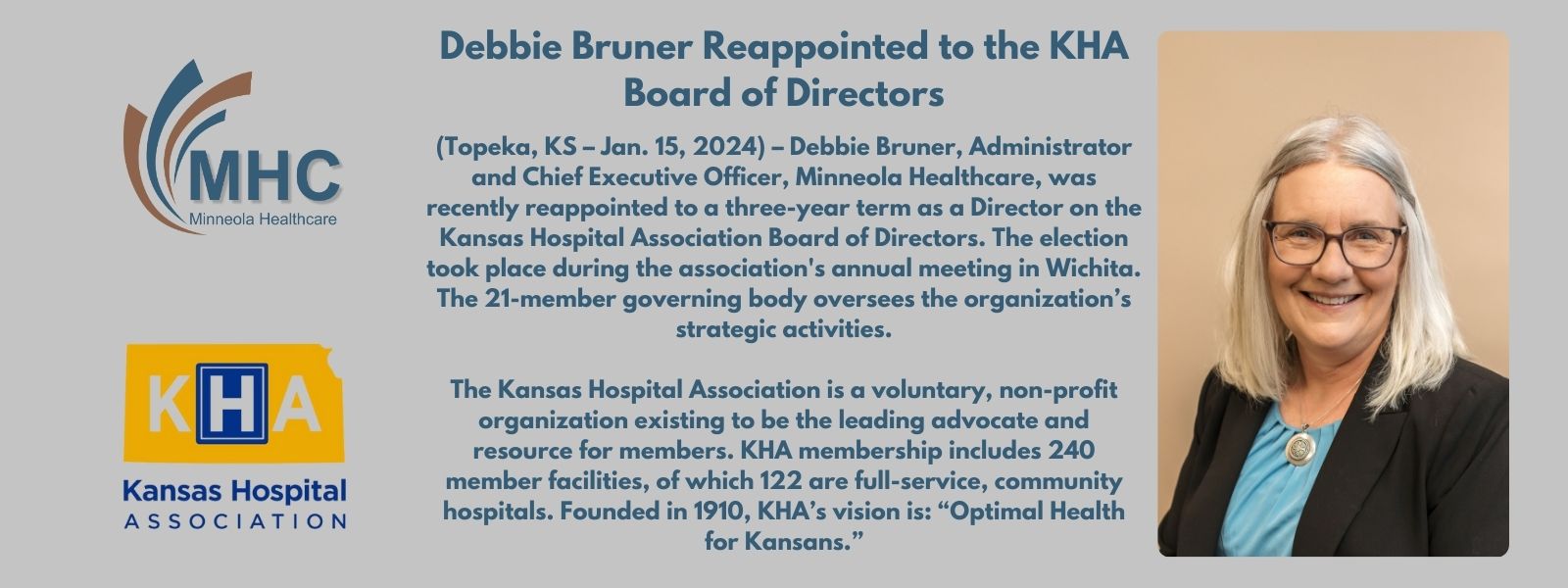 (Topeka, KS – Jan. 15, 2024) – Deborah Bruner, Administrator and Chief Executive Officer, Minneola Healthcare, was recently reappointed to a three-year term as a Director on the Kansas Hospital Association Board of Directors. The election took place during the association's annual meeting in Wichita. The 21-member governing body oversees the organization’s strategic activities.